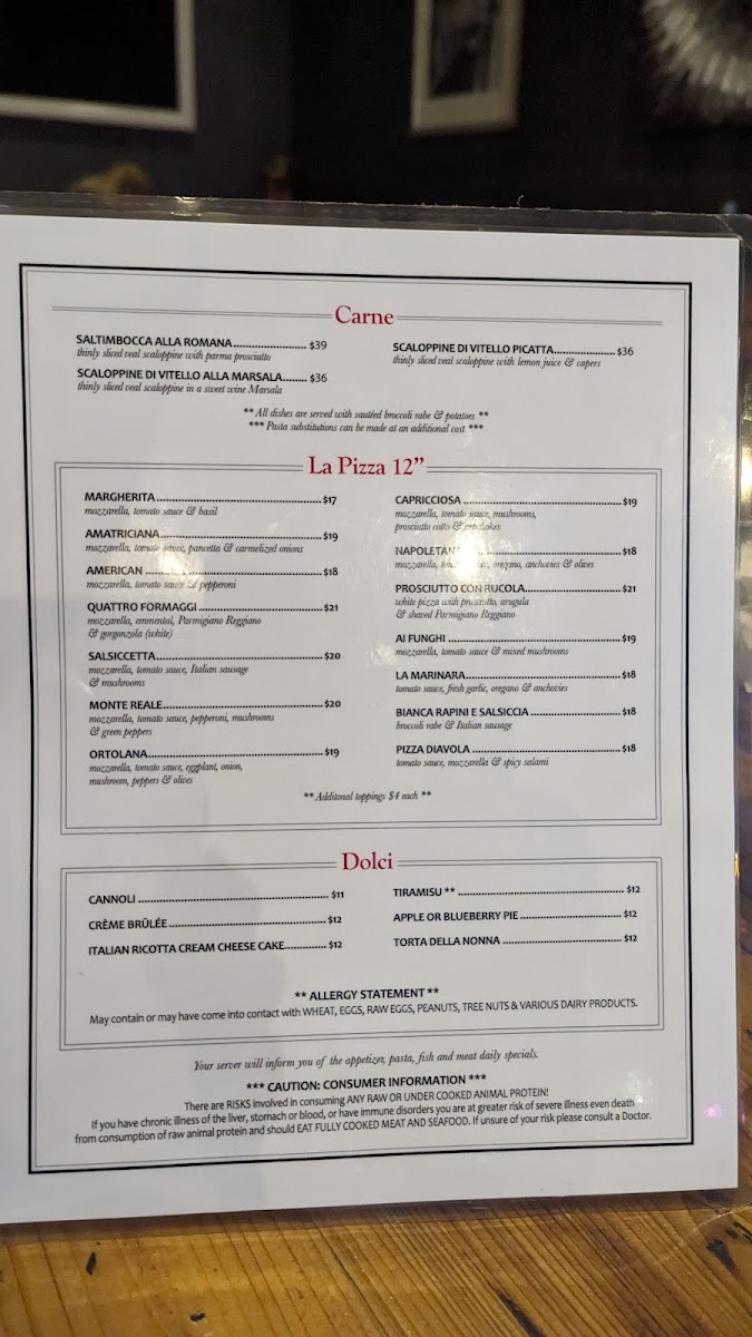 For those craving pasta, La Pasta section provides a variety of options. Penne All'arabiata offers a spicy, flavorful tomato sauce, while Spaghetti Carbonara delivers a creamy, rich taste with eggs and pancetta. Gnocchi con Pomodoro features soft potato dumplings in a tangy tomato sauce, and Orecchietti con Salsiccia e Rapini combines pasta with sausage and sautéed rapini. If you're in the mood for seafood, Linguini con Pomodoro e Tonno (linguini with tomato and tuna) is a refreshing choice.