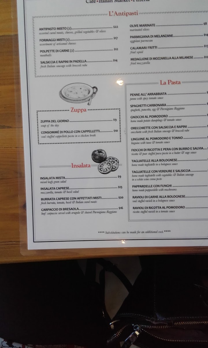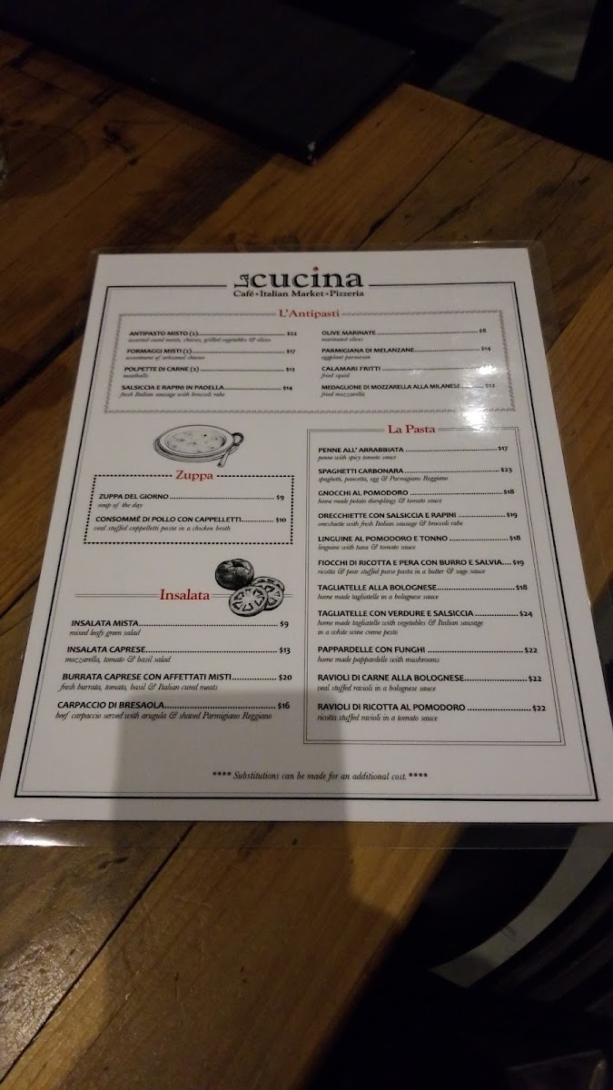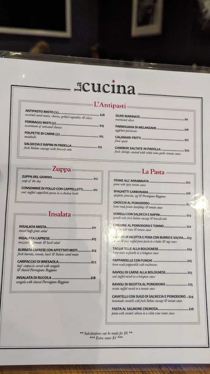 La Cucina offers a delightful and varied menu that showcases the best of Italian cuisine, with dishes that cater to a range of tastes. Starting with L'Antipasti, guests can enjoy a selection of starters like Zuppa del Giorno (soup of the day), Antipasto Misto and Formaggi Misto (both priced at $2), Polpette di Carne (meatballs), and Salsiccia e Rapini in Padella (sausage and broccoli rabe sautéed), offering a balance of flavors to begin your meal.